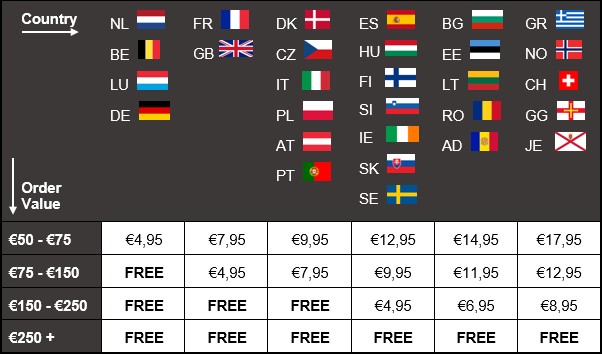 Pour clarifier les coûts d'expédition éventuels, Menga Trading a créé un aperçu des coûts d'expédition par pays, en fonction du montant commandé.