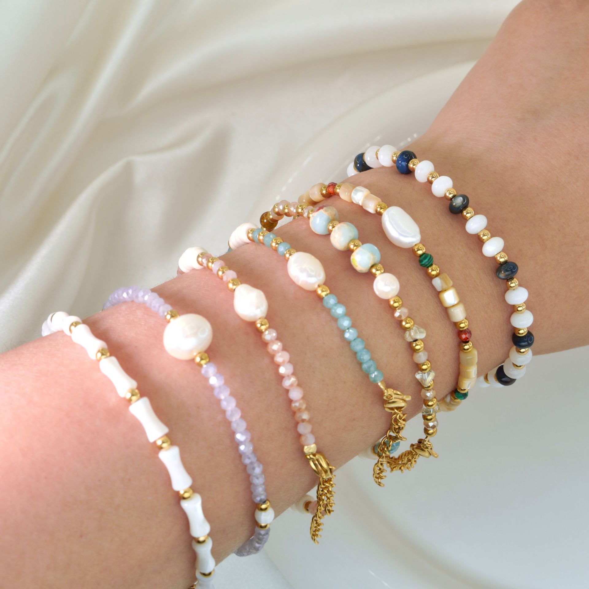 Présentation du bracelet en acier inoxydable E-C7.2 B2583-025G avec perles et perles de verre, un superbe accessoire qui allie sans effort élégance et style contemporain. Ce bracelet exquis présente un mélange harmonieux de perles de verre brillantes et de perles véritables, créant un attrait visuel captivant, parfait pour toute occasion.