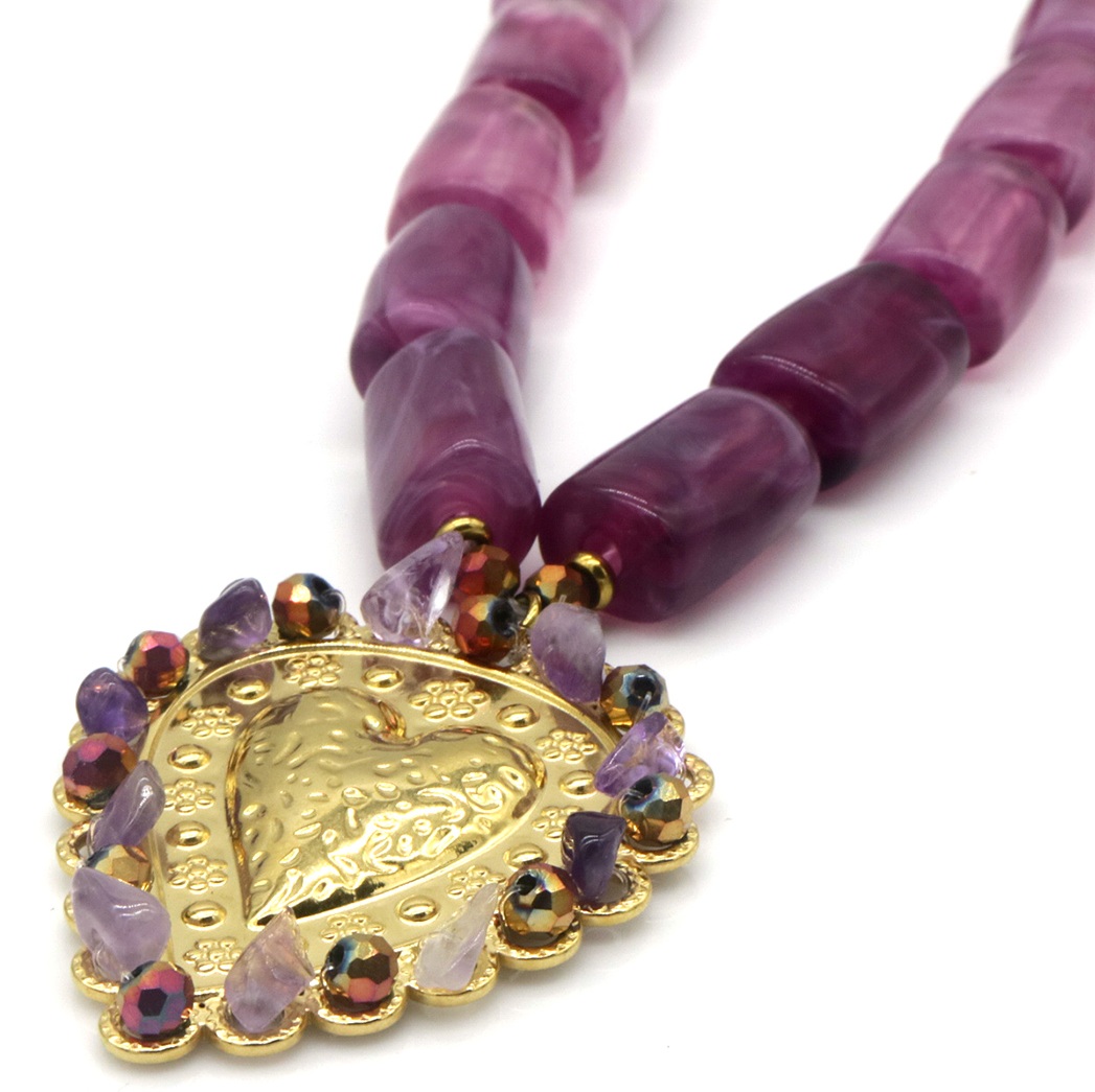 Orné de perles acryliques violettes vibrantes, ce collier ajoute une touche de couleur à n'importe quelle tenue, ce qui en fait la pièce parfaite pour les occasions décontractées et formelles. La longueur réglable de 40 à 45 cm permet un ajustement confortable, garantissant qu'il se situe parfaitement autour de votre décolleté.