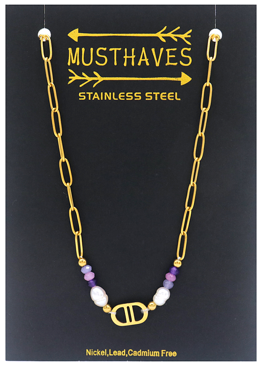 Titre : G-A16.3 N221-307 Collier de perles d'eau douce en acier inoxydable — Violet, 40–45 cm