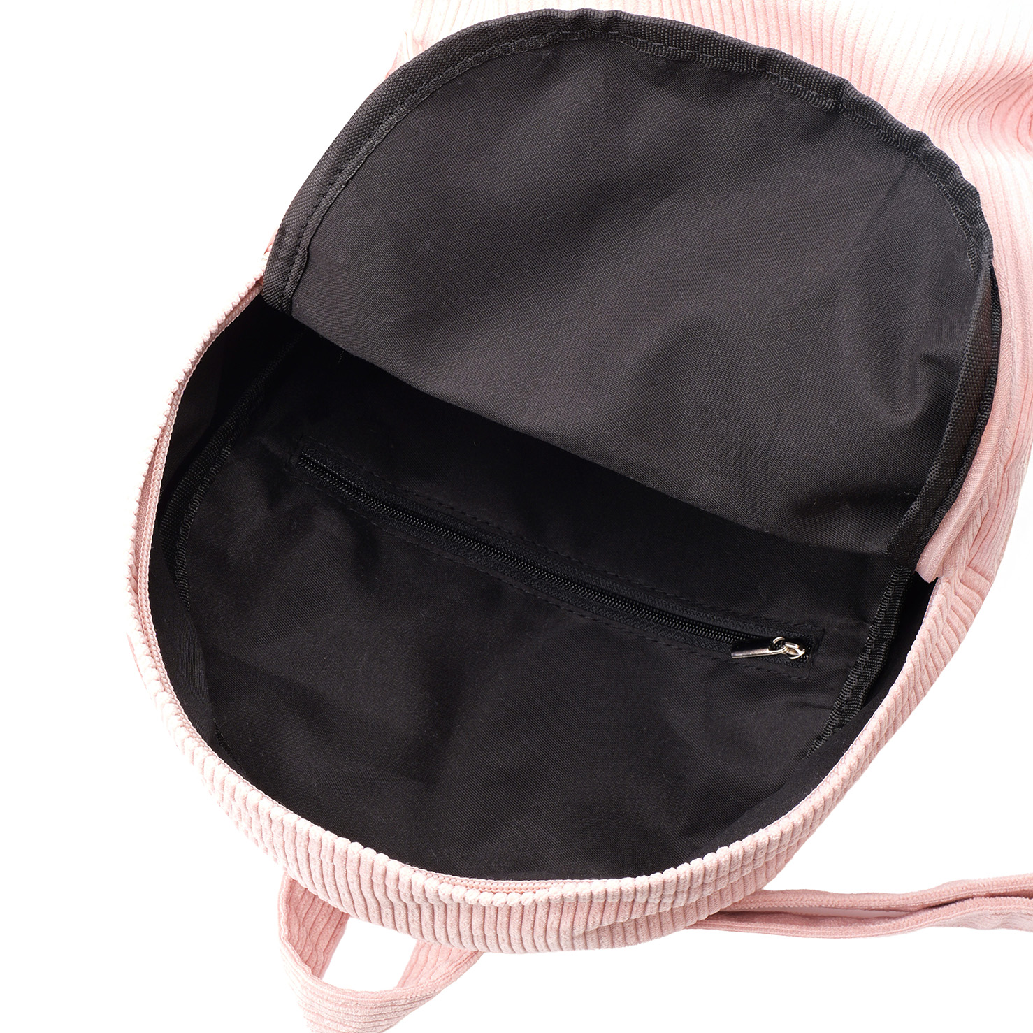 Présentation du sac à dos en tissu côtelé T-A6.1 BAG1117-008-5 dans une charmante teinte rose, conçu pour allier style et fonctionnalité pour vos besoins quotidiens. Mesurant 32x29x14cm, ce sac à dos compact mais spacieux est parfait pour l'école, le travail ou les loisirs.