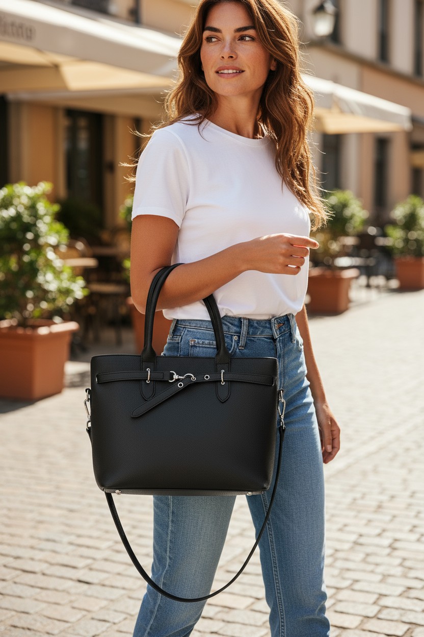 Avec des poignées confortables et une bandoulière réglable, ce sac offre plusieurs options de transport pour votre commodité. La construction légère garantit une utilisation facile, tandis que la finition noire chic ajoute une touche d'élégance à n'importe quelle tenue.